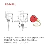 - Note: Disconnect the power to the fan before removing the old switch. Make sure to write down the position of all wires that you disconnect in the process of removing the switch. Do not cut wires from old switch, but remove by inserting blade of very small screwdriver next to wire and pulling out. Then insert the tinned wires in the same order as removed into the new switch." (If you cut the wire you will lose the stiff tinned end and make it difficult to insert into the new switch unless you strip and re-tin it again with a soldering iron) Model No.: ZE-268S1 Specification: 1. 3 speed control: High, Medium, Low 2. 4 Wire :OFF,L-1, L-2, L-3 3. Switch Type: Pull chain switch 4. Thickness: 2 centimeters 5. Operating voltage: 125-250 V 6. Overload current: 6 A 7. Rotation angle: 360 degrees 8. Finish: Nickel, Brass,Antique 9. Electrical Rating: 6A/125VAC - 3A/250VAC 10.Certifications: UL approved (USA) - CSA certified (Canada) Package: 1PCS Ceiling Fan Switch