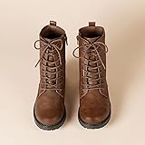 COMFORT AND FIT: These lug-sole combat boots have a padded insole with high-quality memory foam for added comfort, lace-up closure for adjustability, and an inside zipper for easy entry. MATERIAL: Amazon Essentials shoes are made from high-quality alternative leather materials. This style has a faux buffalo grain leather upper and is lined in faux leather. STYLE: These ankle boots have a back pull tab, metal eyelets, heavy weight stitching throughout, and a lug-sole. DETAILS: 1.25 inch heel with a flexible non-slip sole. Shaft height measures 6 inches from where your heel sits to the top of the shaft. DESIGN: These versatile boots take you anywhere and can be paired with your favorite Amazon Essentials outfit.