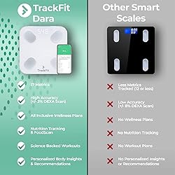 17 DIFFERENT BODY MEASUREMENTS - FitTrack’s Dual BIA Technology uses two different frequencies to accurately find 17 different measurements, including body mass index, muscle mass, and obesity level. UP TO 8 USERS PER DEVICE - FitTrack recognizes users and tracks results for up to 8 different people, including your baby, while keeping individual results private. INTEGRATED APP FOR iOS AND ANDROID - Scan the QR code on manual or the back of the scale to download the app, the app keeps your measurements on your smartphone device. Track the progress of your body health indicators and set weigh-in reminders. WEIGHT MANAGEMENT - FitTrack Dara helps you be more aware of how your diet and lifestyle affects each aspect of your body health. Athlete & infant modes increase effectiveness for all types of users. AWARD-WINNING PRECISION TECHNOLOGY - FitTrack prides itself on manufacturing precise weighing mechanisms that ensure body composition measurement accuracy.