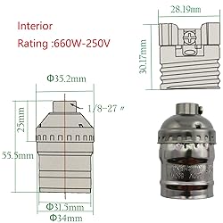 - Type:E26/E27 Light Sockets Size:55.5 x35.2 x55.5mm Color: Black Shell material: aluminum Rating:660W-250V Easy to install ,satisfy your various needs. Suitable for home,restaurant,bar,coffee shop and DIY lamp projects, make unique style lamps in accordance with your own wish. Package included: 2pcs Light Sockets Note: Please allow 1-3mm error due to manual measurement. Thanks for your understanding.