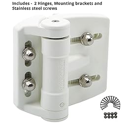 THREE WAY ADJUSTABILITY - Patented tension adjustment system enables you to adjust the tension for closing speed, and adjust vertically and horizontally for a perfect fit POOL AND SAFETY FENCES - Rigorous testing has proven these hinges are trusted for child water safety around pools, daycares, and pet barriers LOW MAINTENANCE - These self-lubricating hinges are made of industrial strength "metal replacement" polymer and stainless steel components; will never rust FOR METAL, WOOD OR VINYL GATES - This durable gate hinge is made for square post metal, wood or vinyl gates weighing up to 55 pounds with a 7/8” – 2” gate frame to fence post gap COMES WITH - Two hinges, mounting brackets, and stainless steel screws. Remove old hinges before installing new hinges.