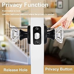 - Brand Name: SHINY HANDLESProduct Description:Product name: Crystal Interior Door Knobs with Lock Bedroom/Bathroom, round shape.Finish: Matte Black.Material:zinc alloy,genuine crystal glass(clear,NOT FADE).Door thickness: fits all doors 1-3/8" to 1-3/4" thick.Backset:2-3/8",2-3/4".Functions And Applications:Function:Privacy function.Applications: The privacy/bed/bath function is ideal for bathrooms, bedrooms, and any room where privacy is needed.