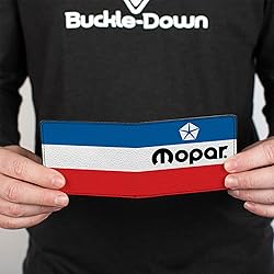 • This awesome men's bi-fold wallet is made from premium vegan leather. It measures 4.0x3.5x0.5 Inches, and features the standard billfold, 5 card slots, and windowed ID holder. The logos are applied using advanced printing technologies, so the wallet will still look good after years of hard use. This product is made by Buckle-Down, Inc. and Officially Licensed by Mopar.