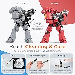 Set of 16 Detail Paint Brushes - Various shapes and sizes including Liners 4/0, 3/0, 2/0, 0 & 1. Rounds 4/0, 3/0, 2/0, 0, 1, 2, 4. Flats 2/0, 0, 1, 2. Tight Spot 0. Satisfies all you needs of detail painting and model painting Premium Quality - Made with quality synthetic hair, soft and absorptive, without the unwanted hair splitting or shedding. Secured with durable aluminum double crimped ferrules, the brush hair won’t fall off easily, makes it sturdy and long-lasting Ergonomic Triangular Handle - The miniature paint brushes are designed with triangular handle with 7 layers UV coated, providing the perfect combination between balance and comfort, you can paint for as long as you want without pain. And they won't roll off the table Perfect for All Sorts of Detailing - Great for paint by numbers, miniature models, army paint, rock painting, figurines, nail art, face painting, action figures and doll houses. Works well with all mediums like acrylic, watercolor, oil. You will have the right tool for all of your hobbies and crafts project Portable Paint Brushes Case - Comes with a brush holder and a velvet dust bag to protect the paint brush. The compact size fits well in a backpack or carry bag, very convenient to carry with for outdoor painting or traveling. A thoughtful gift for artists, painters, students, and model enthusiasts, perfect for birthdays, holidays, or any special occasion