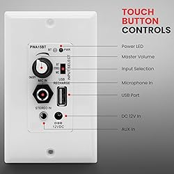• Control Bluetooth wireless music streaming in any room with the Pyle In-Wall Amplifier System. This wall plate receiver adds convenient microphone paging ability along with simple source audio control. Install the system on any wall in the home or office to unlock versatile sound configuration that is easily accessible. Built-in Bluetooth allows you to stream music to a connected intercom or speaker system hassle-free. Enjoy features like rotary control volume adjustment, 1/4'' mic input, USB port for device charging -- along with an Aux (3. 5mm) audio jack for connecting and streaming audio from external devices. The rear panel speaker terminal block allows you to connect the receiver to a pair of speakers. Universal standard size gang plate fits most deep electrical boxes and allows for a clean installation. Add convenient audio control with the Pyle PWA15BT. 5 In-Wall / Wall Plate Bluetooth Audio Control Receiver.