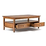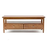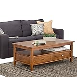 SIMPLIHOME Warm Shaker Coffee Table - 48 inch Wide Solid Wood Coffee Table in Light Golden Brown, Transitional Living Room Table with 2 Drawers, Open Shelf, Shaker Fronts and Tapered Legs