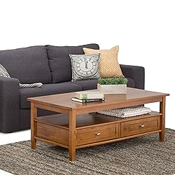 - The Warm Shaker Coffee Table blends classic shaker style with practical living room storage. Measuring 48 inches wide and 18 inches high, this generously sized coffee table is handcrafted from solid wood and finished in a light golden brown stain protected by NC lacquer for added durability. Two drawers with smooth metal glides offer concealed storage for remotes, magazines, or accessories, while a large open shelf keeps everyday items within easy reach. With shaker-style drawer fronts, bronze knobs, square tapered legs, and a square-edged tabletop, this transitional table offers timeless design that fits beautifully in both formal and casual settings.