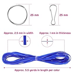• Plastic Lacing Cord: Material: PVC plastic Colors: 25 colors Shape: flat Size: 2.5 x 1 mm in width and thickness Length: 5.5 yards per color Snap Clip Hooks: Material: metal Size: 1 inch in length Colors: silver Quantity: 10 pieces Key rings: Material: metal Size: 1 inch in diameter Colors: silver Quantity: 10 pieces Package Includes: - 25 colors plastic lacing cord - 10 pieces snap clip hooks - 10 pieces key rings