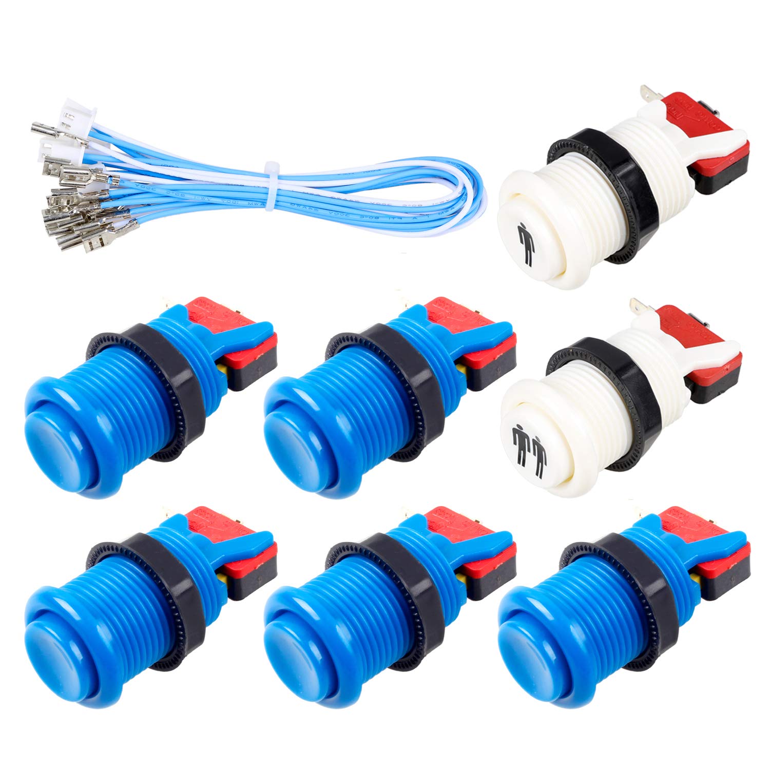 - Product Description 1.Each Encoder have its own USB Cable to make sure that Multiplayer can play the games in the same condition! 2.The Joystick is a square 8 way professional joystick! 3.The buttons are Chrome 5V LED Illuminated push buttons with build-in Blue switch inside. 4.The buttons default as lighted all the time. 5.Joystick hole diameter: 24mm, large button hole diameter: 28-30mm Package Included 1x Zero Delay LED USB Encoder 1x USB Cable 1x 5Pin wires for Joystick 10x 3Pin wires for LED Push Buttons 2x 5V LED 30mm Ring-Fixing LED White Push Buttons (1 Player + 2x Coin) 8x 5V LED 30mm Ring-Fixing LED Push Buttons (2x Red, 2x Yellow, 2x Blue, 2x Green) 1x 5Pin Square 8 way joystick 1x Install Description Tips for installation 1. Plese read our user manual before starting your diy actions. 2. It's very important! Connect Joystick's 5Pin cable to the 5Pin slot that opposite the USB-B terminal. A lot people connect the joystick to the wrong 5Pin slot. 3. There is no need separate the button's functions when you connect wire to push buttons and encoder board exept you want add " Auto-Fire", " Tubro", "Clear" & " Mode" Functions. All the fight button functions can be set in MAME or RetroPie. "Auto-Fire", "Tubro","Clear" & "Mode" Functions have its own slot on the encoder board. 4. For Professional Players. We suggest your change all the buttons and joysticks into SANWA Brand or SEIMITSU Brand. Tips for New User: 1. The item need work with MAME emulator. So before your build your own project, please download one to work with the parts. 2. If you use this kit to build your own Raspberry Pi Retropie Projects. Please search the steps before your DIY.