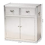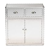 Constructed from metal Silver finish Two (2) drawers One (1) compartment behind two (2) doors Rivet embellishments