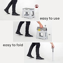 - Distinctly designed, this stylish folding stools for adults unique aesthetic adds a fun twist to an everyday tool. Vigar's Compact Stepping Stool is the perfect addition to your home's kitchen, bathroom, or any space where a little extra height is helpful. Made from durable polypropylene built to last, this multipurpose foot stool lets you clean the top of the refrigerator, reach high cabinets, use a shower stool for inside shower, and use a kitchen step stool for adults. A strong, textured base prevents slippage, and stabilizing, non-slip rubber feet keep the heavy duty step stool in place. Foldable step stool for adults, an internal two-handle makes for easy carrying and hanging storage. Simply folds and unfolds with a single, effortless movement. It holds up to 330 pounds, and it measures 20.0-inch high by 1.3-inch wide by 16.9-inch long when folded and 16.1-inch high by 14.6-inch wide by 16.9-inch long when unfolded for easy storage in your cleaning closet. To clean, wipe with a cloth and water as needed.