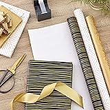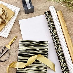 Each roll of wrapping paper measures 30 inches wide. White marble and antiqued marigold each measure 12 feet long for 30 square feet per roll. Black and gold holographic measures 10 feet long equaling 25 square feet. 85 total square feet in the set. Three sophisticated designs on premium paper stock: Black and sparkly gold holographic foil (no glitter!); Gold geometric outlines on white marble; Antiqued marigold. Each roll in this 3-pack of premium gift wrap features grid lines on the reverse side for straight cutting and perfectly wrapped presents. Bold and versatile designs easily elevate any gift and brighten celebrations year-round, including birthdays, weddings, graduations, bridal showers, Valentine's Day, holidays and more. Crafted from high-quality paper materials, Hallmark's gift wrap is made with paper from well-managed forests. Made in the USA with European paper.