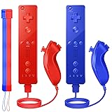 PGYFDAL Wii Controller 2 Pack, Wii Remote Controller and Nunchuck Joystick with Silicone Case and Wrist Strap for Holiday (Red and Dark Blue)
