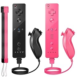 PGYFDAL Wii Controller 2 Pack, Wii Remote Controller and Nunchuck Joystick with Silicone Case and Wrist Strap for Holiday (Black and Pink)