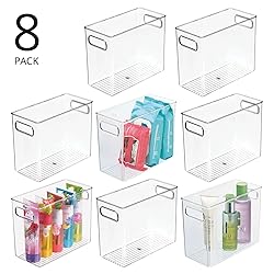 SMART STORAGE: This tall organizer bin fits bath bombs or salts, health and beauty must-haves, makeup, cosmetic wipes, applicators, eye pencils, lip sticks, mascara, extra sponges, scrubbers, serums, lotions, cream and oils; Use in a cabinet to keep first-aid supplies on hand and ready to go; Perfect for wellness items, store vitamin bottles, medicine, aspirin, bandages, ointment and creams; Works well in bathroom cabinets or under the sink to stash essentials or cleaning supplies; Set of 8 PORTABLE: This tote features easy-carry, built-in handles to make it simple to transport items to the bathroom counter, vanity or makeup table; Just grab and go; This bin is deep enough for storing shampoos, soaps, conditioners, moisturizers, hair styling products and body wash; Open tops make it easy to see what is inside and quickly grab what you need; Try these inside cabinets and cupboards or under your sink for cleaning supplies or toiletries FUNCTIONAL & VERSATILE: This great organizing caddy is the perfect solution for storing a multitude of household items like cleaning products, medical supplies, cosmetics, video games, toys, lotions, linens, laundry needs, craft or school supplies and more; The options are endless; Great for college dorm rooms, apartments, condos, RVs, cabins and campers; Use this multi-purpose basket anywhere you need to add storage and get organized; Ideal for home and professional organizers QUALITY CONSTRUCTION: Made of durable plastic; EASY CARE: Clean with mild soap and water; Do not place in dishwasher THOUGHTFULLY SIZED: Overall Outer Dimensions: 9.58" x 4.58" x 8" high; Tapered design; Inside bottom 9.4" x 4.4"