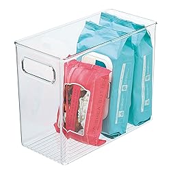 - These Tall Bathroom Storage Organizer Bins from mDesign makes it simple and easy to store and organize everything is your bath or shower space. Contain everything from bars of soap, extra face or hand towels, sponges, makeup, cosmetic supplies, first-aid essentials such as bandages, adhesive tape and gauze to nail care including clippers, polish, emery boards, lacquers and even bathroom cleaning products. Built-in handles let you transport from shelf to cabinet to vanity countertop. Open tops let you see what is stashed inside and quickly grab what you need. Mix and match with other mDesign bins to create a custom storage solution for your home. modern living by Design.