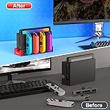 Charging Dock for Nintendo Switch & OLED Model Joycons: This charger is matched with the original switch dock, charging for Joy con. Available to charge 1-4pcs controllers at the same time so that it will help you save time and increase efficiency. Easy to Use: Just connect the charger to the original console dock to get power input, and then plug your switch joycons into the charging station. NOTE: No extra cord needed. It has a USB plug built into the side, just plug into your Switch's docking station and use the power from there. Integrated design, simple and does not occupy space. Security Protection: The charger dock for joycon built-in protection chip is with perfect over-charge, over-voltage, over-Current, over circuit protection functions, more safe and reliable. Low standby power consumption, electricity-saving, and environment-friendly. LED Indicators: There are individual LED indicators for Joy Con, which allows the charging status at a glance. Plug in each slot for Joycon, the corresonding indicator icons turn red when charging, and they will turn blue when fully charged/standby. Keep Organized for Joycons: This charger stand keeps organized for joycons and does not take up a huge amount of space. The charging station is such a great display for Nintendo Switch Joycon! It is a perfect gift for Nintendo Switch gamer.
