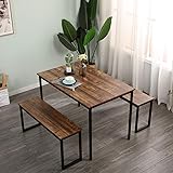 DlandHome Dining Table Set for 4, Kitchen Table Set with 2 Benches, 3 Piece Dining Room Table and Benches, Kitchen Coffee Table Set for Flats, Industrial Style Wooden Kitchen and Dining Room Set