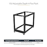- The 15U open frame rack lets you store your standard 19 inch servers, network and telecommunications equipment in a sturdy, adjustable depth open-frame rack. Easy to Assemble Designed with ease of use in mind, this 15U 4 post rack offers easy-to-read markings for both rack units (U) and depth, with a wide range of mounting depth adjustments (22-40 in.) that make it easy to adapt the adjustable data rack to fit your equipment. Durable Design This durable free standing server rack supports a static loading capacity of up to 1200 lb. (544 kg) and portable rolling weight capacity of 660 lb. (300 kg). The computer rack also features offers compliance with the EIA/ECA-310 standard for a universal design that's compatible with most network equipment rack equipment. For a complete server storage solution that saves you time and hassle, the mobile AV rack includes optional accessories such as casters, leveling feet and cable management hooks. The base is also pre-drilled for securely fastening the rack to the floor if needed, providing you with additional stability while free standing. Guaranteed Reliability 4POSTRACK15U is backed by a StarTech.com 2-year warranty and free lifetime technical support.