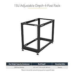ADJUSTABLE DEPTH: 4-Post 15U 19" open frame server rack with 4 vertical rails and adjustable mounting depth 22" to 40" (56,0cm to 101,7cm); Compatible with various servers / switches / data / AV and other IT equipment; EIA/ECA-310-E Compliant EASY ASSEMBLY: Mobile network rack with easy-to-follow assembly instructions and online video; Compact flat-pack shipping to avoid damage and facilitate installation; Only 30in (77cm) high, ideal for utility/server closets or narrow home/office spaces COLD ROLLED STEEL: Durable 4 Post 19" open frame rack designed for ventilation with 15U mounting height and 1200lb (544kg) weight capacity (stationary); 3 install options included: casters, levelling feet, or base-plate to secure rack to the floor HARDWARE INCLUDED: Rolling computer/data rack includes cage nuts and screws to mount equipment, easy to read Units (U) and depth adjustment markings, cable management hooks for organization, and required assembly tools THE IT PRO'S CHOICE: Designed and built for IT Professionals, this 15U rack is backed for 2-years, including free lifetime 24/5 multi-lingual technical assistance