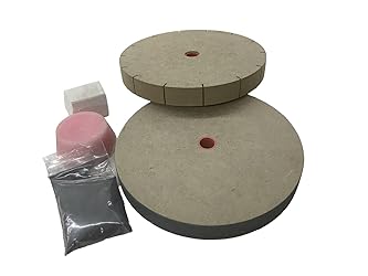 ⚙️ Complete Sharpening Kit – Includes one 6” x 3/4” sharpening wheel, one 6” x 3/4” slotted honing wheel, 4 oz. white rouge, 1.5 oz. lubricant, and 1.5 oz. of 220-grit silicon carbide powder. 🔩 Fits Standard Bench Grinders – Wheels have 5/8” arbor holes and come with bushings to fit 1/2” shafts. Works with most 6” bench grinders. 🔥 Cool Sharpening Process – Included lubricant keeps blades cool and prevents overheating during sharpening. ✨ Clean, Mirror-Finish Honing – White rouge delivers a bright polish without discoloring the blade. 🔧 Reconditionable Wheels – Slots can be cleaned and restored as described in the included instructions. Max speed: 4200 RPM.