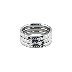 • These are hand-stamped, shiny finish, stackable 3mm wide stainless steel rings. Stainless steel rings are a great alternative to sterling silver and/or gold as they are inexpensive, hypoallergenic, will not tarnish, and they will not turn your finger green! These rings are available in WHOLE SIZES ONLY and are great for a Mother's Day gift or just to showcase your child(ren)'s/grandchild(ren)'s names. This set is priced for UP TO 25 CHARACTERS on each tiny 3mm band. Font is as pictured on each ring (Micaila and KelliRae are UNICASE Fonts, which means they have both upper and lowercase letters mixed together). Maximum font size is 1.5mm to ensure the letters fit on the band (Santiago is a full upper/lowercase so letter size will vary…lowercase letters average about 1mm in size). Names on the tiny 3mm band will be separated with your choice of heart, dot, or ampersand. **The main picture is where you will find the fonts available. You do not receive three rings unless you select three rings upon checkout** The letters in the ring are darkened before shipment; however, over time it may lighten with use. Instructions are provided on how you can easily redarken the letters at home as the engraving (stamping) will always be there.