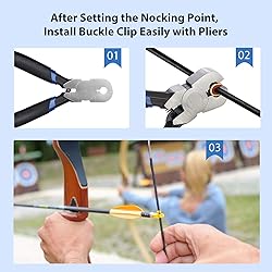 Package includes: 1 x archery nocking buckle plier, 6 x bowstring nock sets archery, 1 x T shape bow square, easily install all sizes of nocking points and retainer clips without damaging your bowstring Good material: the inner layer is antiskid nylon, it can protect the bow string well. Warm reminder: Please note that some parts of the tool are sharp, so be careful when using it Portable: knocking plier with comfortable grip coated handles, fits into your quiver pouch or bow case Practical design: T square attaches to string above and below the nocking point Easy to use: small and light weight design is simple to use
