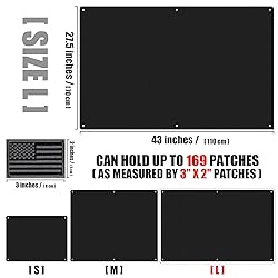 Material: 1000D durable Nylon with Loop Surface, easy to fasten and remove your patches. 3 Sizes for you choose. S: 60 x 45 CM/ 23.6" x 17.7"; M: 85 x 70CM/ 33" x 27.5"; L: 110 x 70 CM/ 43" x 27.5". It's easy to organize Patches with molle hook. Perfect display for all of your tactical, PVC, and fabric patches. With Steel Rings you could hang on any place you like. Package only include IronSeals Patch Holders and 1*Flag Patch as Bonus, other items are not included. Your satisfaction is our ultimate goal. Please contact us directly if any question.