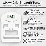 ACCURATELY GAUGE GRIP STRENGTH: Perfect for athletic training, home and clinical use, the Vive Precision grip strength tester is equipped with a high-precision strain gauge sensor for accurately measuring grip strength up to 198 pounds. Testing grip strength is necessary for sports such as rock climbing, wrestling and gymnastics and also provides a valuable indicator of overall health. STORES UP TO 19 USER PROFILES: Great for youth and adult sports teams, the compact grip trainer stores up to 19 user profiles complete with gender and age for easily tracking progress. The unit also recalls the last record grip strength test for each profile and visibly indicates whether the current test shows an increase or a decrease in hand strength. ADJUSTS FOR EVERY HAND SIZE: Easily adjust the Vive Precision grip strength tester to fit any youth or adult hand size with the adjustable knob. A correct fit provides a more comfortable experience and also ensures greater accuracy. LARGE, EASY TO READ DISPLAY: View the captured grip strength in pounds or kilograms, range indicators and user profile on the bright, easy to read LCD display. The screen provides a weak, normal or strong indicator, grip fluctuation indicator and an increase or decrease from the last test. VIVE GUARANTEE: One year guarantee so you can purchase now with confidence.