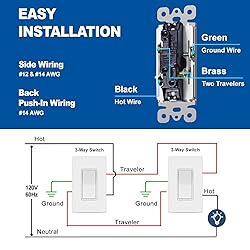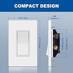 3 Way Light Switch: Rated for 15A/120-227V. Works as both a Single-Pole (one location) and a 3-Way switch (two locations). Provides smooth and easy on/off operation for your lights High Quality: Sturdy construction made of high-quality, impact resistant polycarbonate thermoplastic and internal solid steel for extended service life Easy Installation: Featuring both quick-connect push-in terminals for #14 AWG solid copper wire and side screw terminals for wires up to #12 AWG. The shallow design and break-off plaster ears ensure a perfect fit in standard electrical boxes Modern Design: Matching decorator screwless wall plates included. Its sleek and minimalist design adds a touch of contemporary elegance to any room, including living rooms, bedrooms, and kitchens Wide Application: UL Listed. Suitable for residential use and most commercial areas such as offices, schools, stores, shops, restaurants, public facilities, and hotels