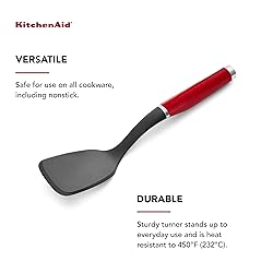 - The KitchenAid Large Solid Turner features an oversized turner surface that makes flipping, folding, and serving food easy. The ergonomic handle provides optimal comfort and control. The turner head is heat resistant to 450°F/232°C and safe for all cookware, including non-stick. Highly durable, the sturdy construction stands up to everyday use. Dishwasher safe.