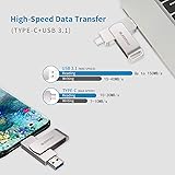 2 in 1 cable-free USB Type-C flash drive, made it simple to free up space and transfer files between your smartphones, tablets, laptop and PCs with up to 256GB capacity(The actual storage is less due to different file systems, partitioning arrangement and other factors) No APPs or software installation needed, simply connect your mobile devices and move content with OTG(on the go) support. Effectively backup your photos, files and more Ultra Fast Data Transfer Speed - Impressive performance USB 3.1 Gen 1 drive with up to 150MB/s transfer speed(Actual speed may vary by the usage condition. Connecting to USB 3.0 port improves the performance.) Made of zinc alloy, this USB-C thumb drive features greater strength and resistance 5-year manufacturer warranty with free tech support