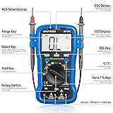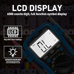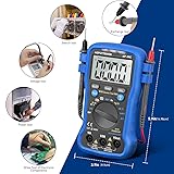 【6000 Counts Digital Multimeter】6000 Counts display, sampling time 2-3/sec,so it can accurately measure DC Voltage 600.0mV - 600V, AC Voltage 6.000V - 600V, AC/DC Current 600mA - 10A, Resistance 600 ohm-60M ohm, Capacitance 9.999nF - 99.99mF, Temperature -4 - 1832℉, Frequency 9.999Hz -9.999MHz, Duty Cycle 0.1%-99.9%, Battery test 1.5V/9V 【“REL” for Zeroing Out】 Press “REL” button to zero out the meter before measurement, the multimeter will test out the most accurate readings, especially useful for measurement micro reading subject 【Keep Your Hands Free】Built with a rear magnet & Kick Stand & wrist/hang strap, allows you hang the meter upright for better viewing, tie it on your wrist, affix it to a metal surface (breaker box) etc. to free your hands for taking measurements 【9V Battery Included】 It comes with a graphical instruction manual and 9V battery to get you started. It’s Lightweight, portable with multimeter case, auto shut down to save your battery, which make it a perfect pocket multimeter to carry around 【Easy to Use】39C Auto Ranging Digital Multimeter can sense the brightness of the working environment, light up automatically in dark, which saves you trouble to turn on/off all the time. It can also display the environment temp, and test liquid temp with the Temperature Probe(included)