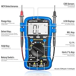 - Digital Multimete AP-39C Auto Ranging TRMS Multimeter for AC DC Voltage,Current, Resistance, Capacitance Tester with Temp Battery LED Test Auto Backlit Specifications:1. AC Volt: 6V/600V (resolution 100mV/1V, accuracy +/- 1.2% + 20)2. DC Voltage: 600mV/ 6V/60V/600V/600V(resolution 0.1mV/1mV/10mV/100mV/1V, accuracy +/- 0.5% to 1.0% + 10)3. DC/AC Current Amp:600μA/6000μA/60mA/600mA/6A/10A(resolution 1μA/10μA/100μA/10mA, accuracy +/- 1.5% to 3.0% + 10~20)4. Resistance: 600Ω/6KΩ/60KΩ/600KΩ/6MΩ/60MΩ(resolution 0.1/1/10/100/1000 ohm, accuracy +/- 0.8% to 1.5% + 20~25)5. Temperature:-20 to 1000 degrees Celsius More Functions:ContinuityData HoldDiode TestBacklight DisplayTrue RMSNCVRelative ValueAuto Power Off℃/℉ Switch Package Included:1x Magnetite1x Lanyard1x 9V Battery1x Test Leads1x User Manual1x AP-39C Digital Multimeter1x Temperature thermocouple ★★★100% Gurantee Warranty★★★Lifetime tech support, 100% guaranteed to let you buy this digital multimeter confidently. if you have any problems with our multimeter, just contact us, we will solve the problems within 24h.
