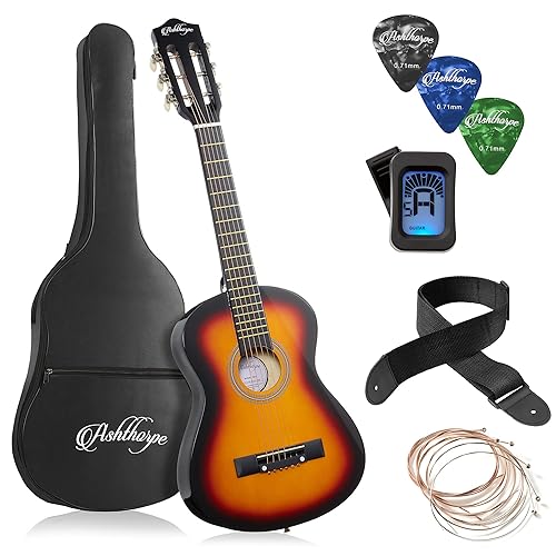 Perfect beginner guitar: Specially designed for students and teens who are just getting started. This 38-inch, right-handed, acoustic guitar features all the bells and whistles. Designed with 18 smooth frets, 6 steel strings, and easy to hold neck. Complete starter kit: Entry-level guitar bundle includes 38-inch acoustic guitar, nylon bag, 3 picks (of assorted colors), shoulder strap, digital tuner, pitch pipe, an extra set of 6 strings, and an instructional sheet. Superior-grade tonewoods: Top, back, and sides are crafted from laminated basswood for versatility and warmth, with a high-gloss finish. Whether playing soft or loud, strumming or flatpicking, this guitar remains responsive and retains its tonal integrity. This guitar is built to last. Incredible sound: Perfect for musicians-in-the-making, this beginner acoustic guitar features an impressive tone, bright sound, and standout projection. It's waiting to be heard. Full-size, lightweight guitar: Ideal for learners, this guitar is both small and lightweight, measuring 38" Long x 14" Wide x 3.25" Deep.