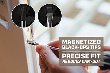 CR-MO heat-treated blade for up to up to 2X longer tip life Magnetized, black-ops coated tips for a precise fit that reduces cam-out Max-control, MOA grip and thumb press for up to 40% more torque Compatible with SRS Retention Lanyards for added safety Handle slot accepts other screwdrivers for added leverage Marked end caps for quick identification of tip type 100’ drop-tested to ensure durability on the harshest jobsites Includes two slotted (3/16-in x 4-in, 1/4-in x 4-in) and two Phillips (PH1 x 3-in, PH2 x 4-in) screwdrivers Limited lifetime warranty