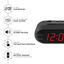 NEVER OVERSLEEP AGAIN — ASCENDING LOUD ALARM - Alarm begins gently and increases in volume to reliably wake heavy sleepers without sudden shock. Designed for consistent, confident wake-ups every morning. LARGE EASY-TO-READ RED LED DISPLAY - Clear bright numbers are visible across the room day or night. Perfect bedside clock for adults, seniors, kids, dorm rooms, and anyone who wants instant time visibility without glasses. EASY-SET DESIGN — NO CONFUSING MENUS - Simple controls make setting the time and alarm fast and frustration-free. Ideal for seniors, children, or anyone tired of complicated modern clocks. DUAL ALARMS FOR WEEKDAY & WEEKEND ROUTINES - Set two separate alarms without resetting daily schedules. Great for couples, workdays vs weekends, or different wake-up times. RELIABLE WITH BATTERY BACKUP PROTECTION - Plug-in powered for dependable performance with battery backup to maintain settings during power outages so your alarm is always ready when you need it. (Requires 2x AA batteries, sold separately)