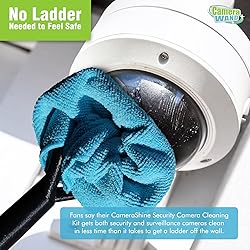 - Fans say this kit gets security cameras clean in less time than it takes to get a ladder off the wall (all without damaging lenses or housings). Tired of cloudy, streaky security camera images that hide potential threats CameraShine’s Security Camera Cleaning Kit is a fast and easy way to clean your surveillance cameras for razor-sharp, crystal clear images so you can feel safe again.★ Patent-pending Flexi-Clean head★ See-Clear Dual cleaning solution★ Optical-grade finishing towels Flexi-Clean Head Saves Your Lenses And HousingsProfessionals choose the CameraShine system over other options because the patent-pending Flexi-Clean Head lets them easily clean any camera in hard-to-reach locations, but without destroying expensive lenses and housings (even large and small dome cameras).Use Any Fixed Or Retractable Painter’s Pole:✔ Fits painter's poles✔ Fits most broom poles✔ Fits most mop poles[Note: Pole not included] Feel Confident Fast With Crystal-Clear Images (Without Damaging Domes And Lenses)Forget streaky, cloudy images... The team at CameraShine created this kit for their own family’s safety. That's why it quickly removes haze and grime from high-resolution security cameras with the See-Clear cleaning solution that cleans so gently it can be used right on camera sensors and lenses; yet is powerful enough to remove dried-on rainwater, dust, mud, and bird grime without scratching or damaging expensive lenses and costly domes.You get 8oz of this Hybrid camera cleaner plus 2 Microfiber towels so you can enjoy better protection for home and family with razor-sharp daytime & nighttime images. But don’t take our word for it…Try the CameraShine Kit for yourself and see why so many are enjoying ladder-free cleaning and clear images that let them feel safe again.
