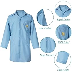 ESD Lab Coat with Lapel Collar, 3 Pockets & Snap Cuffs, Knee Length Anti-Static Jacket