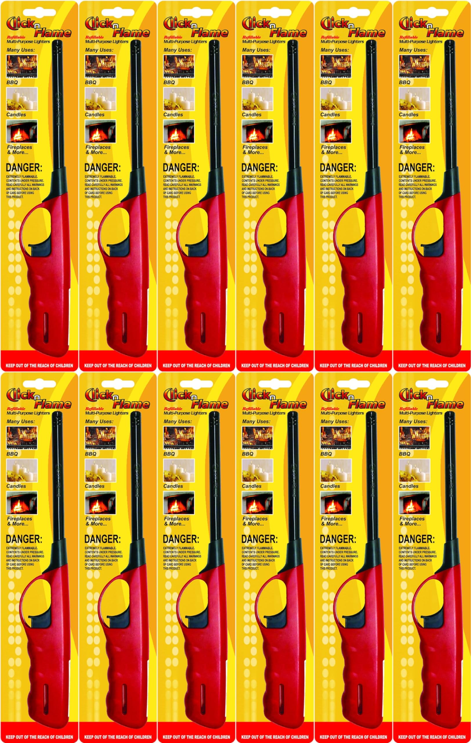 - The Click n Flame Utility Lighter Value 4 pack contains 2 Standard Multi-Purpose Lighter, 1 Wind Resistant Utility Lighter, and 1 Flexible Utility Lighter. The Wind Resistant Lighter is great for your outdoor activities, and the Flexible Utility Lighter is great for hard to reach places, such as, candles and pilot lights. The Standard multi-purpose lighters are great for lighting grills and fireplaces and can be used indoors or outdoors.