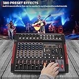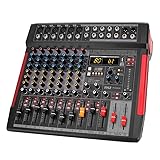8 CHANNEL: The 8 channel audio interface controller DJ mixer machine is the perfect way to mix audio from MP3, mic & external devices. Each channel has its own independent master volume control & independent balance/high + low frequency adjustment 380 PRESET EFFECTS: Pyle professional audio mixer streaming system has a built-in sound effects processor w/ 380 digital effects that can be applied to synthesized/recorded sounds. Choose from 6 sound effects (normal/rock/pop/classical/jazz/country) 16 INPUTS: Pyle DJ mixer USB audio interface mixer is equipped w/ 6 mic & 6 line input for mic, instrument/audio device, 6.35 jack (L/R) stereo input, 2 AUX inputs & USB port. Also has 6.35mm headphone output jack & mute, PFL buttons on mono channels EQ CONTROLS: The sound mixer USB interface mixer features built-in SUB output & EQ control for MP3, smooth rotary faders for mic/USB/line/master controls w/ 2-Band EQ & pan on each channel, voice echo/effect/delay, input selection. Works w/ Mac & PC +48V PHANTOM POWER: For the reliable power source, the stage/studio sound mixing console features a +48V phantom power supply. has ultra-low noise design with high headroom and exquisite plastic chassis. Perfect for both beginners & professional