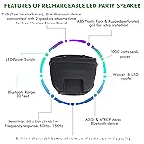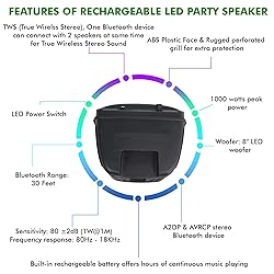- This 8 Inch Rechargeable Bluetooth LED Speaker comes with a peak power of 1000 watts. It has a built-in rechargeable battery which allows you hours of continuous music playing. The TWS (True Wireless Stereo), One Bluetooth device can connect with 2 speakers at the same time for True Wireless Stereo Sound. Bluetooth compatibility allows for wireless connection to any A2DP stereo Bluetooth device and it has Bluetooth range up to 30 ft.