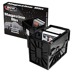- Introducing the BCW Magazine & Document Bin - the ultimate solution for organizing your magazines, documents, and more with ease and durability. Crafted from heavy-duty, acid-free plastic, this bin ensures your valuable items are stored safely for years to come. These magazine storage boxes have enhanced security features include sliding locks on the lid panels, providing added peace of mind for your valuable contents. They also come equipped with a movable partition that aids in organizing and supporting your growing stack of papers, offering customizable storage solutions. Versatile storage capacity accommodates up to 80 magazines. This bin can also hold document toploaders, magazine toploaders (5mm and 7mm thicknesses), and even golden age comic books. With its durable construction and versatile functionality, the BCW Magazine & Document Bin is the perfect storage solution for collectors, librarians, and office professionals alike. Keep your cherished items organized, protected, and easily accessible with this premium-quality bin.