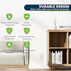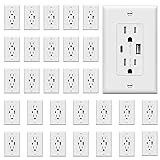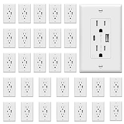 In-wall 2-port USB charging outlet with an output of 3A USB-C and 2.4A USB-A (for a total max output of 3.6A); includes 1x Type-A USB port, 1x Type-C USB port, and two 15A tamper-resistant plug outlets; does not support fast charging technologies Allows you to charge USB devices while leaving room for other appliances; charge up to three USB devices simultaneously without adapters; perfect for kitchen, bedroom, living room, and commercial locations Patented IntelliChip technology recognizes the power needs of individual devices to charge at optimal speeds without overcharging or overheating Decorator receptacle features tamper-resistant shutters to prevent unwanted objects from being inserted; complies with 2017 NEC Article 406.12 30 Pack; White color; maximum total output of 3.6A (3A USB-C and 2.4A USB-A); 15A, 125VAC; back & side wired for easy installation; UL listed; includes wall plate