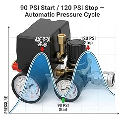 PRECISE SWITCH RANGE: Automatically activates at 90 PSI and stops at 120 PSI for stable compressor control. STANDARD THREAD TYPE: Built with G1/4 BSP joints, not compatible with NPT-threaded compressors. STURDY METAL HOUSING: Reinforced ABS cover with iron fittings provides corrosion resistance and long operation life. EASY DEVICE CONNECTION: Pre-assembled dual gauges and regulator ready for quick tool installation. FOR MULTIPLE USES: Perfect for workshops, garages, and pneumatic equipment setups up to 175 PSI.