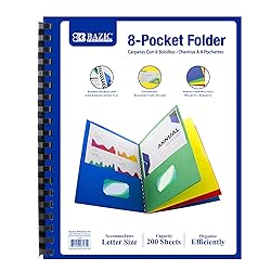 - Designed for structured organization, the BAZIC Products portfolio helps manage documents efficiently across school, business, and everyday office use. This practical 8 pocket folder provides clearly separated sections that allow users to group paperwork by subject, project, or priority without mixing pages, supporting faster access and improved workflow. The portfolio features a slim, book-style format with double loop wire binding that allows pages to flip smoothly and remain open during use. This makes it suitable for presentations, reviews, or reference tasks where visibility and ease of navigation matter. The organized layout functions effectively as a folder with multiple pockets, offering a clean alternative to loose papers or stacked files. Sized to accommodate standard documents, the portfolio supports commonly used paperwork found in classrooms and offices. Its compatibility with file folders letter size materials ensures papers fit neatly without bending, making it convenient for storage in backpacks, briefcases, or desk drawers. Each interior pocket includes a slot for labeling, allowing users to customize sections for quick identification. This structure supports efficient sorting for assignments, proposals, reports, or reference documents while maintaining a tidy appearance. The design also works well as a lightweight pocket organizer for users who prefer portable document control without bulk. Suitable for students, professionals, and educators, this organizer integrates easily into daily routines. It can be used alongside planners, binders, or filing systems to maintain consistency across document management methods. As a compact option within organized portfolios, it supports both temporary and ongoing storage needs. Backed by BAZIC Products, this durable organizer is designed for dependable everyday use. Whether managing paperwork at school or relying on a practical folder for office tasks, it delivers simple, effective organization for documents that need to stay accessible and orderly.
