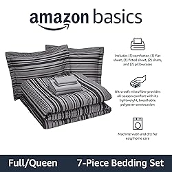 Amazon Basics Full/Queen Comforter Set with Sheets, 7-Piece Gray Calvin Stripe Bedding, Lightweight Microfiber Bed-in-a-Bag, Striped