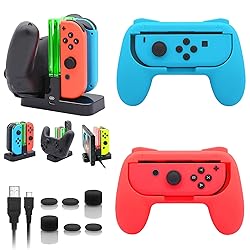 MULTIFUNCTION - Can charging 4 contoller for Joycons or 1 for Pro Controller and 2 contoller for Joycons at the same time.(No include Switch, contoller for Joycons and for Pro Controller) GET READY FOR PLAY - It is safe and convenient to put your Switch Team on this display stand, and keep them organized and ready for play. It's also allows you to maintain a clean and neat desktop. SUGGESTION - If you want to use our dock to charge your Switch Console, you can use Switch Official ac adapter to connect the dock, then the charging speed will be faster. FASTSNAIL EXCLUSIVE MATERIALS - FASTSNAIL grips made of exclusive materials, with premium rubber non-slip matte surface for excellent grip. DIFFERENT with the other grips on Amazon. Scratch free, attractive appearance, touch is the best. ERGONOMIC DESIGN - IMPROVER SL and SR buttons to extend the lifespan. Ergonomic design provides superior grip and enhanced comfort. Allow you to play for longer such for Mario Kart and Street Fighter Ultra.