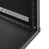 SPECIFICATIONS: Crafted from heavy-duty cold rolled steel, this 9U server rack measures 23.7" L x 22.1" W x 23" H, with a 132 lbs weight capacity. Features adjustable rails for 2.5 to 22.6-inch depth equipment, in 1.5-inch increments. VERSATILE: Available in 9U, 12U, 15U sizes, this portable server rack includes swiveling casters and side handles, ideal for dynamic IT environments, telecom setups, and A/V systems, offering easy transport and adaptability. DESIGNED FOR EFFICIENCY: With top and bottom slots, this data rack promotes neat cable organization. The open frame and perforated ventilation aid in cooling and provide easy access, suitable for server and network equipment. Perforated ventilation on the top and bottom sides helps cool your networking equipment. Perforated ventilation on the top and bottom sides helps cool your networking equipment.
