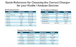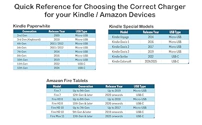 Important Notes: There are different types or variations of cables used to charge kindles and fire tablets. Please read product details below to know which USB type or variation to buy. Choose the Micro USB cable for old generation Kindle Paperwhite, Oasis e-readers Fire HD tablets released 2019 and older (2nd generation to 10th generation). See product description for more details. Choose the USB-C cable for new generation Kindle Paperwhite e-readers and Fire released after 2020 (11th generation or newer), Scribe, Fire Max 11, Kindle Colorsoft. See product description for more details. General rule for choosing the right cable: For Amazon Kindle and Fire HD tablets released 2019 and older, use micro USB. For Amazon Kindle and Fire HD tablets released after 2020, use USB-C. Product includes one (1) USB charge cable for Amazon Kindle Paperwhite, DX, Keyboard, Oasis, Scribe, Fire HD Tablets and kids e-readers.